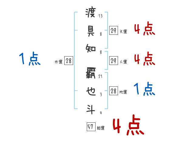 外運![]() | 渡具知覇也斗さんの外運は28画の1つ星!家庭環境に注意。スポーツで活躍できる能力があるかも。 生活面を象徴する運勢です。外部から受ける影響力を表し、結婚運、家庭運や職場、環境への順応性を表します。 |
