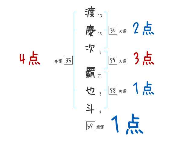 天運![]() | 渡慶次覇也斗さんの天運は34画の2つ星!独創性に優れるが、自尊心が強く災難に注意しましょう。 家系が持つ宿命的な運勢を表します。祖先から受け継いだ苗字ですので自分の力が及びません。家柄を象徴します。 |