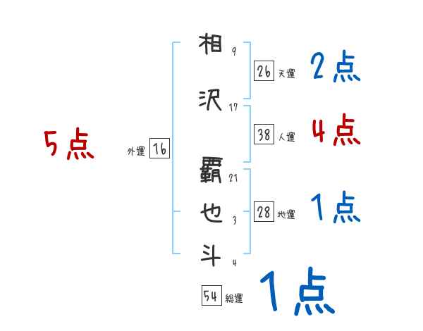 外運![]() | 相沢覇也斗さんの外運は16画の5つ星!人望が厚く大きく発展する。逆転成功が見える。 生活面を象徴する運勢です。外部から受ける影響力を表し、結婚運、家庭運や職場、環境への順応性を表します。 |