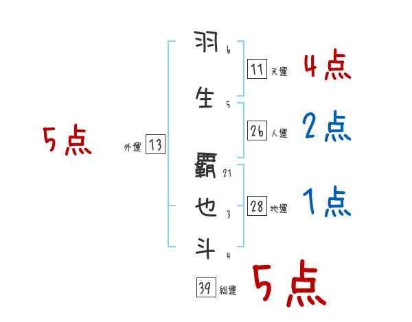 天運![]() | 羽生覇也斗さんの天運は11画の4つ星!着実に富や地位を得る幸運な人生。 家系が持つ宿命的な運勢を表します。祖先から受け継いだ苗字ですので自分の力が及びません。家柄を象徴します。 |
