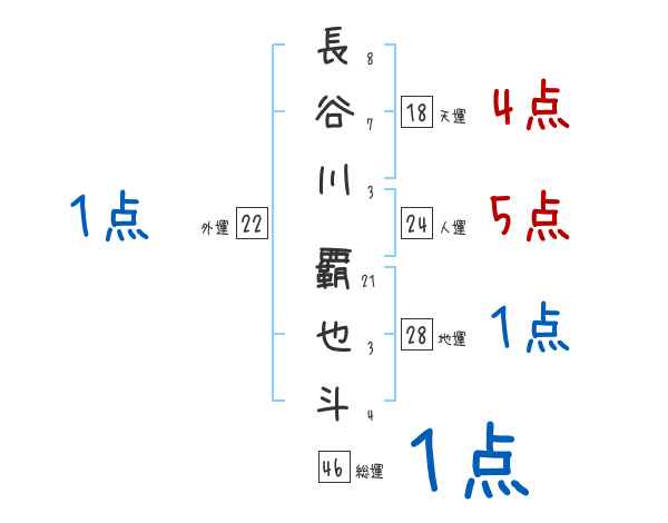 総運![]() | 長谷川覇也斗さんの総運は46画の1つ星!迷走することが多く苦労するかも。目先のことにとらわれないように。 あなたの人生を表す1番重要な運勢です。生涯を通じて影響する総合運となり、主に50歳以降の晩年期に影響を及ぼします。 |
