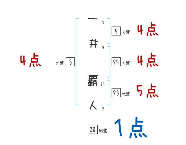 天運![]() | 一井覇人さんの天運は5画の4つ星!健康で安泰。協調性に優れ、財産に恵まれる。 家系が持つ宿命的な運勢を表します。祖先から受け継いだ苗字ですので自分の力が及びません。家柄を象徴します。 |