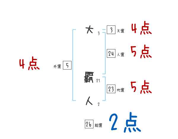 天運![]() | 大覇人さんの天運は3画の4つ星!活動的で才能に恵まれ、多くの信頼を得る。希望に満ち成長する。 家系が持つ宿命的な運勢を表します。祖先から受け継いだ苗字ですので自分の力が及びません。家柄を象徴します。 |