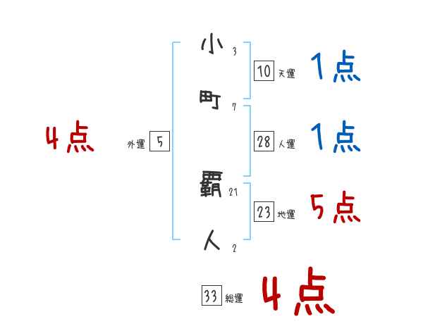 天運![]() | 小町覇人さんの天運は10画の1つ星!不安を感じやすい傾向。ストレスを抱えないように注意しましょう。 家系が持つ宿命的な運勢を表します。祖先から受け継いだ苗字ですので自分の力が及びません。家柄を象徴します。 |