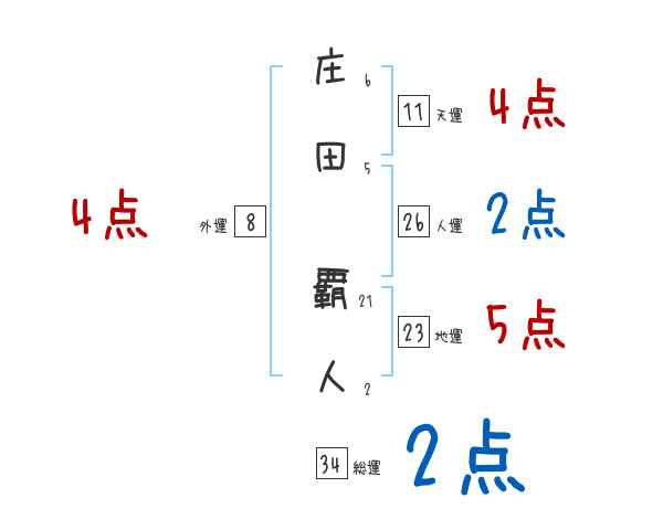 天運![]() | 庄田覇人さんの天運は11画の4つ星!着実に富や地位を得る幸運な人生。 家系が持つ宿命的な運勢を表します。祖先から受け継いだ苗字ですので自分の力が及びません。家柄を象徴します。 |