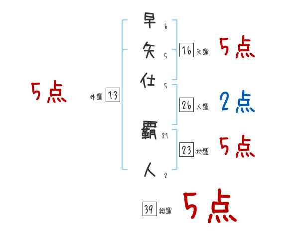 外運![]() | 早矢仕覇人さんの外運は13画の5つ星!才能に恵まれ人気がある。名声を手に入れる。円満な人生。 生活面を象徴する運勢です。外部から受ける影響力を表し、結婚運、家庭運や職場、環境への順応性を表します。 |