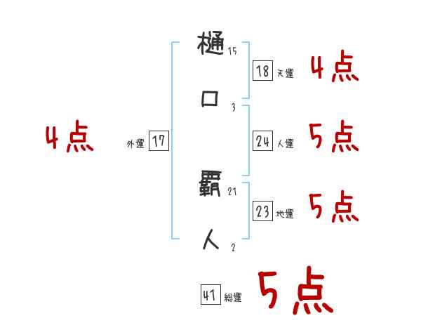 外運![]() | 樋口覇人さんの外運は17画の4つ星!積極的な行動力。地位を気づき財産を手に入れる。純粋な心と直感力。 生活面を象徴する運勢です。外部から受ける影響力を表し、結婚運、家庭運や職場、環境への順応性を表します。 |