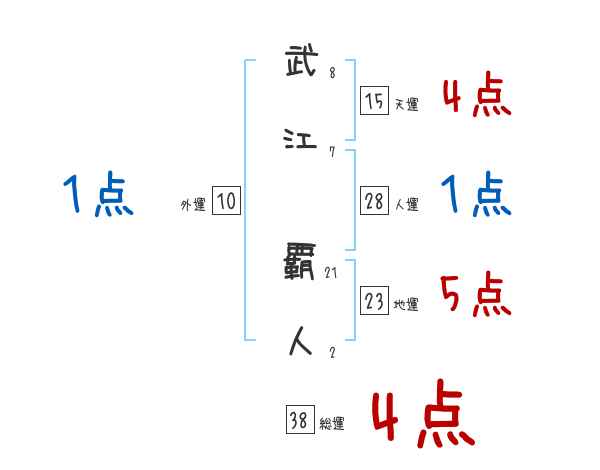天運![]() | 武江覇人さんの天運は15画の4つ星!人徳があり出世する。順調に物事を進め円満な人生。 家系が持つ宿命的な運勢を表します。祖先から受け継いだ苗字ですので自分の力が及びません。家柄を象徴します。 |