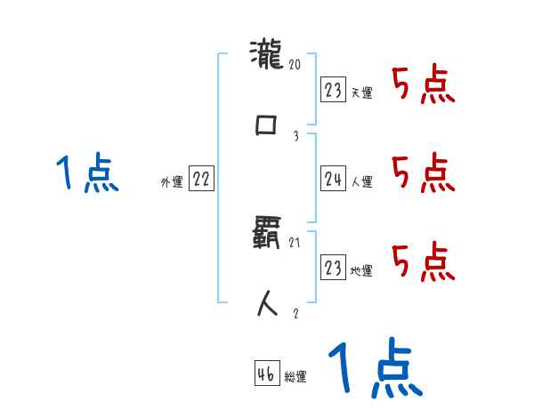 天運![]() | 瀧口覇人さんの天運は23画の5つ星!想像力に優れ活力がある。一代で成功し名誉を手に入れる。 家系が持つ宿命的な運勢を表します。祖先から受け継いだ苗字ですので自分の力が及びません。家柄を象徴します。 |