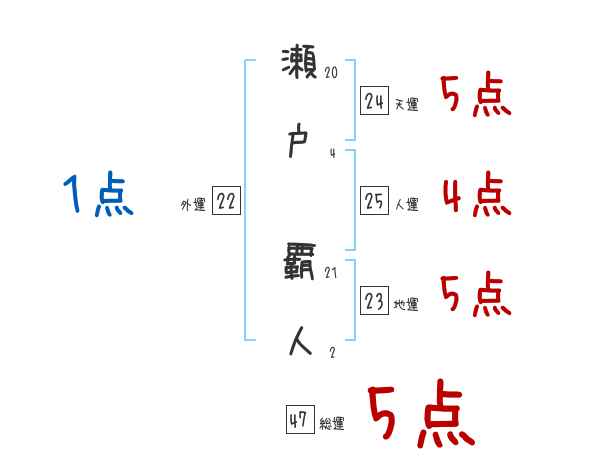 天運![]() | 瀬戸覇人さんの天運は24画の5つ星!家庭運が良く順調な人生。金運にも恵まれる。 家系が持つ宿命的な運勢を表します。祖先から受け継いだ苗字ですので自分の力が及びません。家柄を象徴します。 |