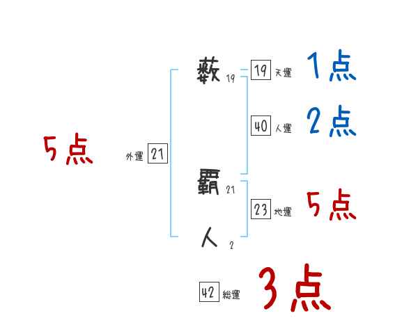 外運![]() | 薮覇人さんの外運は21画の5つ星!統率力がある。独立し成功する。名誉を手に入れる。 生活面を象徴する運勢です。外部から受ける影響力を表し、結婚運、家庭運や職場、環境への順応性を表します。 |