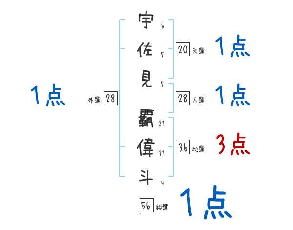 外運![]() | 宇佐見覇偉斗さんの外運は28画の1つ星!家庭環境に注意。スポーツで活躍できる能力があるかも。 生活面を象徴する運勢です。外部から受ける影響力を表し、結婚運、家庭運や職場、環境への順応性を表します。 |