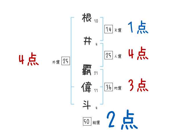 天運![]() | 根井覇偉斗さんの天運は14画の1つ星!人に対して優しいがストレスを溜め込みがち。人間関係のトラブルを避けるよう気をつけましょう。 家系が持つ宿命的な運勢を表します。祖先から受け継いだ苗字ですので自分の力が及びません。家柄を象徴します。 |