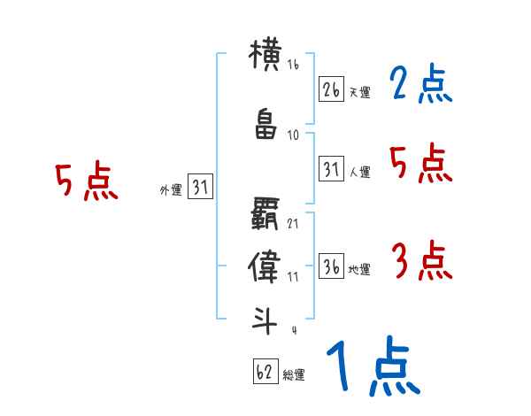 外運![]() | 横畠覇偉斗さんの外運は31画の5つ星!社交性があり判断力に優れる。順風満帆な人生で円満な生活。 生活面を象徴する運勢です。外部から受ける影響力を表し、結婚運、家庭運や職場、環境への順応性を表します。 |