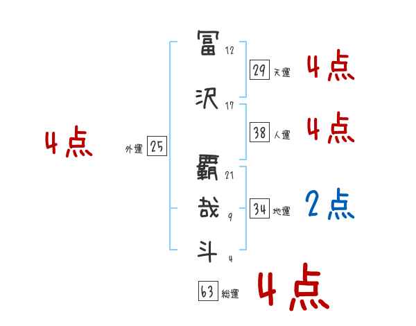 総運![]() | 冨沢覇哉斗さんの総運は63画の4つ星!家庭運がよく順調な生活。温和な性格。 あなたの人生を表す1番重要な運勢です。生涯を通じて影響する総合運となり、主に50歳以降の晩年期に影響を及ぼします。 |