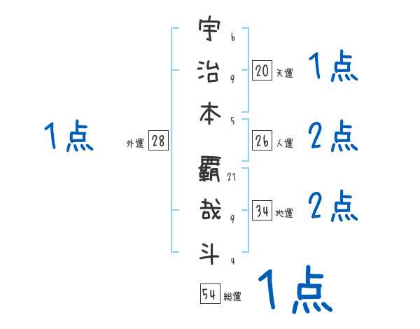 外運![]() | 宇治本覇哉斗さんの外運は28画の1つ星!家庭環境に注意。スポーツで活躍できる能力があるかも。 生活面を象徴する運勢です。外部から受ける影響力を表し、結婚運、家庭運や職場、環境への順応性を表します。 |