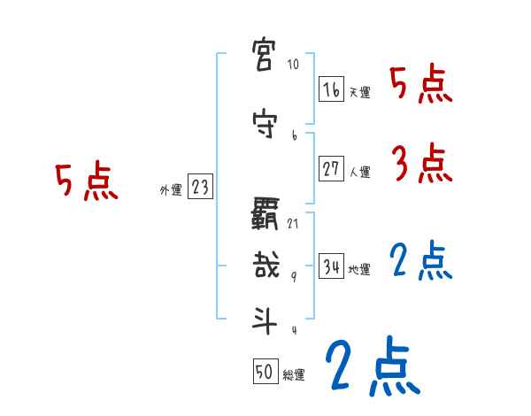 外運![]() | 宮守覇哉斗さんの外運は23画の5つ星!想像力に優れ活力がある。一代で成功し名誉を手に入れる。 生活面を象徴する運勢です。外部から受ける影響力を表し、結婚運、家庭運や職場、環境への順応性を表します。 |