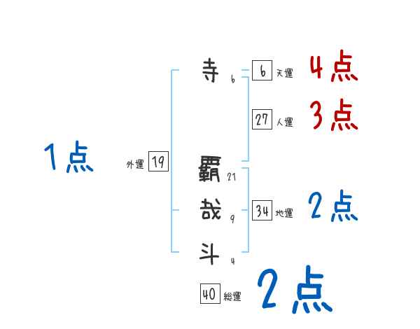 外運![]() | 寺覇哉斗さんの外運は19画の1つ星!優れた才能を持ちますが、協調性が足りないことも。周りの人と協力する事を意識しましょう。 生活面を象徴する運勢です。外部から受ける影響力を表し、結婚運、家庭運や職場、環境への順応性を表します。 |