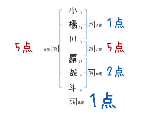 外運![]() | 小橋川覇哉斗さんの外運は32画の5つ星!柔軟性があり成功する。チャンスが多く金運が良い。 生活面を象徴する運勢です。外部から受ける影響力を表し、結婚運、家庭運や職場、環境への順応性を表します。 |