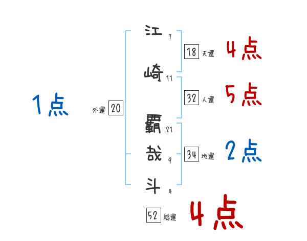 天運![]() | 江崎覇哉斗さんの天運は18画の4つ星!情熱的で剛気。忍耐力があり信頼される。 家系が持つ宿命的な運勢を表します。祖先から受け継いだ苗字ですので自分の力が及びません。家柄を象徴します。 |