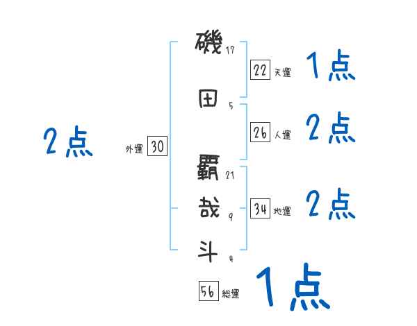 | 地運  | 磯田覇哉斗さんの地運は34画の2つ星!独創性に優れるが、自尊心が強く災難に注意しましょう。個性を表す基礎的な運勢です。性格形成や対人関係、行動力など家庭環境に影響されます。主に誕生してから20歳くらいまでの若年期の運勢を表します。 |