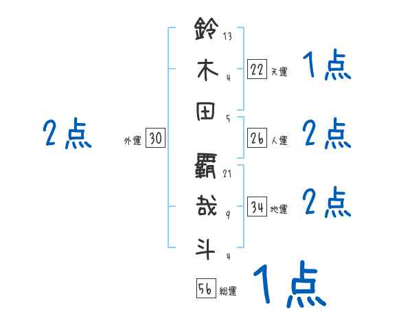 総運![]() | 鈴木田覇哉斗さんの総運は56画の1つ星!消極的で無気力になりがち。誠実な気持ちが必要でしょう。 あなたの人生を表す1番重要な運勢です。生涯を通じて影響する総合運となり、主に50歳以降の晩年期に影響を及ぼします。 |