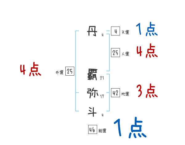 天運![]() | 丹覇弥斗さんの天運は4画の1つ星!感情が不安定で苦労するかも。周囲との協調を心掛けましょう。 家系が持つ宿命的な運勢を表します。祖先から受け継いだ苗字ですので自分の力が及びません。家柄を象徴します。 |