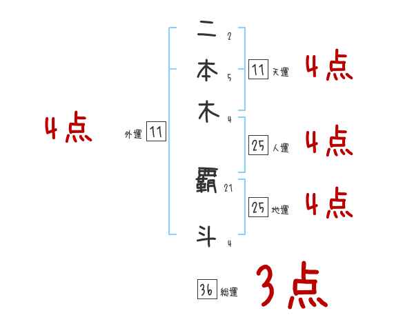 天運![]() | 二本木覇斗さんの天運は11画の4つ星!着実に富や地位を得る幸運な人生。 家系が持つ宿命的な運勢を表します。祖先から受け継いだ苗字ですので自分の力が及びません。家柄を象徴します。 |