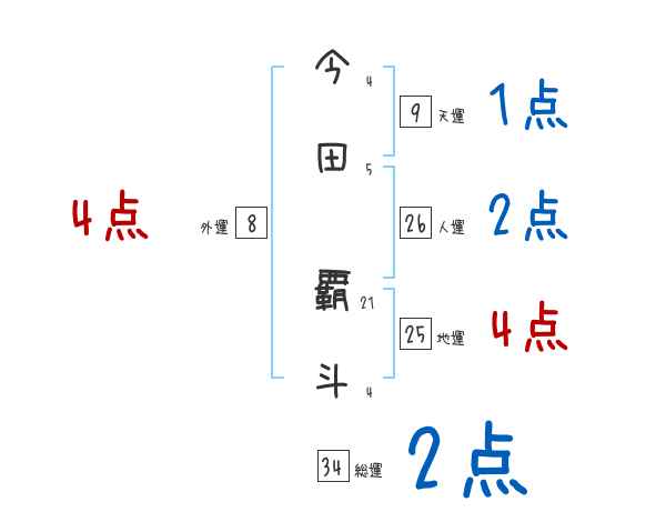 総運![]() | 今田覇斗さんの総運は34画の2つ星!独創性に優れるが、自尊心が強く災難に注意しましょう。 あなたの人生を表す1番重要な運勢です。生涯を通じて影響する総合運となり、主に50歳以降の晩年期に影響を及ぼします。 |