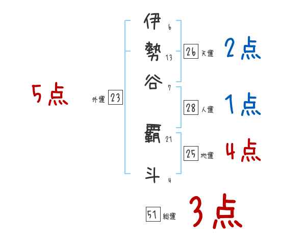 天運![]() | 伊勢谷覇斗さんの天運は26画の2つ星!波瀾万丈かも。信頼できる人を大事にしましょう。 家系が持つ宿命的な運勢を表します。祖先から受け継いだ苗字ですので自分の力が及びません。家柄を象徴します。 |