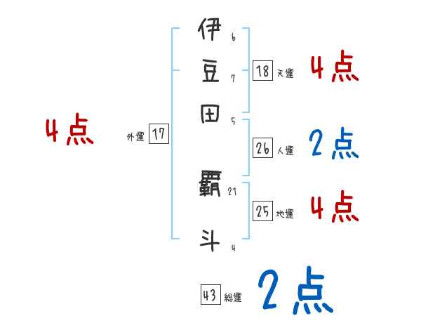 外運![]() | 伊豆田覇斗さんの外運は17画の4つ星!積極的な行動力。地位を気づき財産を手に入れる。純粋な心と直感力。 生活面を象徴する運勢です。外部から受ける影響力を表し、結婚運、家庭運や職場、環境への順応性を表します。 |