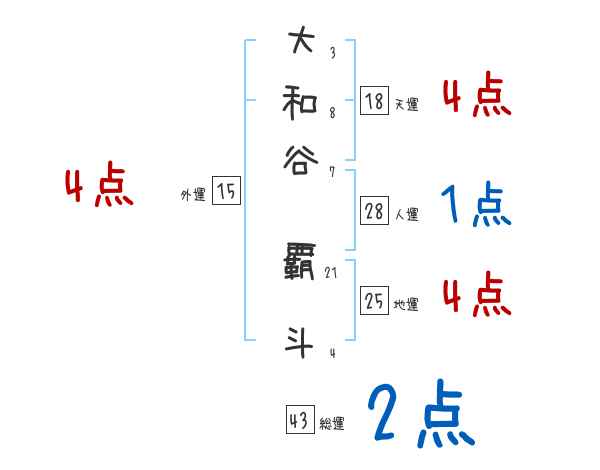 天運![]() | 大和谷覇斗さんの天運は18画の4つ星!情熱的で剛気。忍耐力があり信頼される。 家系が持つ宿命的な運勢を表します。祖先から受け継いだ苗字ですので自分の力が及びません。家柄を象徴します。 |