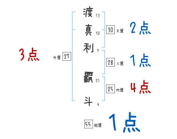 天運![]() | 渡真利覇斗さんの天運は30画の2つ星!浮き沈みの激しさに注意しましょう。 家系が持つ宿命的な運勢を表します。祖先から受け継いだ苗字ですので自分の力が及びません。家柄を象徴します。 |