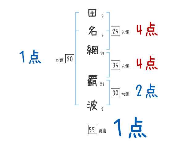 人運![]() | 田名網覇波さんの人運は35画の4つ星!温厚な性格で感受性が高い。穏和な性格で人望が厚い。 性格や才能などを表す2番目に重要な運勢です。人間関係や協調性、社会的な成功に影響します。主に20歳から50歳ぐらいまでの中年期の運勢を表します。 |