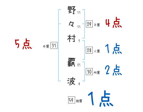 総運![]() | 野々村覇波さんの総運は59画の1つ星!意志の弱さであきらめることが多いかも。粘り強さが必要。 あなたの人生を表す1番重要な運勢です。生涯を通じて影響する総合運となり、主に50歳以降の晩年期に影響を及ぼします。 |