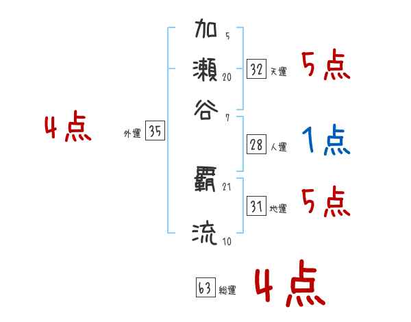天運![]() | 加瀬谷覇流さんの天運は32画の5つ星!柔軟性があり成功する。チャンスが多く金運が良い。 家系が持つ宿命的な運勢を表します。祖先から受け継いだ苗字ですので自分の力が及びません。家柄を象徴します。 |