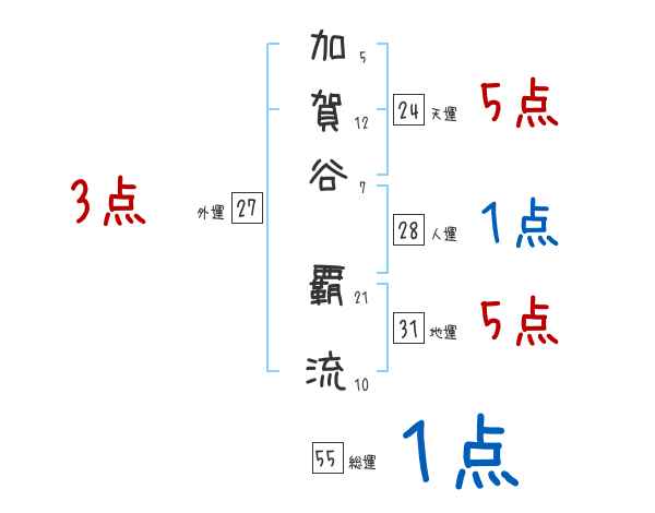 天運![]() | 加賀谷覇流さんの天運は24画の5つ星!家庭運が良く順調な人生。金運にも恵まれる。 家系が持つ宿命的な運勢を表します。祖先から受け継いだ苗字ですので自分の力が及びません。家柄を象徴します。 |
