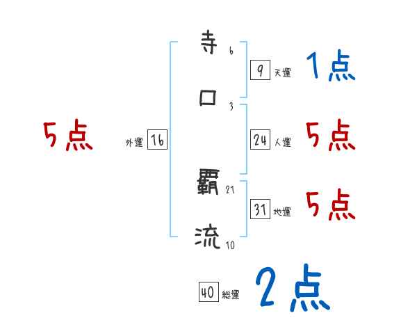 外運![]() | 寺口覇流さんの外運は16画の5つ星!人望が厚く大きく発展する。逆転成功が見える。 生活面を象徴する運勢です。外部から受ける影響力を表し、結婚運、家庭運や職場、環境への順応性を表します。 |