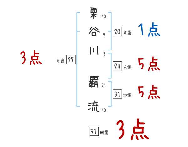 人運![]() | 栗谷川覇流さんの人運は24画の5つ星!家庭運が良く順調な人生。金運にも恵まれる。 性格や才能などを表す2番目に重要な運勢です。人間関係や協調性、社会的な成功に影響します。主に20歳から50歳ぐらいまでの中年期の運勢を表します。 |