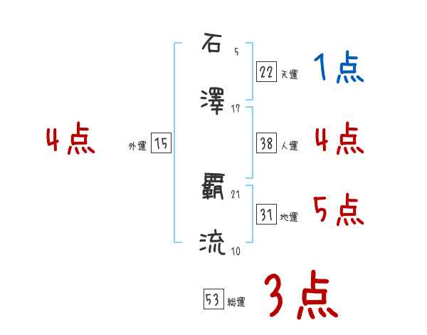 総運![]() | 石澤覇流さんの総運は53画の3つ星!やや見栄っ張りで虚栄心がある。散財に注意。 あなたの人生を表す1番重要な運勢です。生涯を通じて影響する総合運となり、主に50歳以降の晩年期に影響を及ぼします。 |