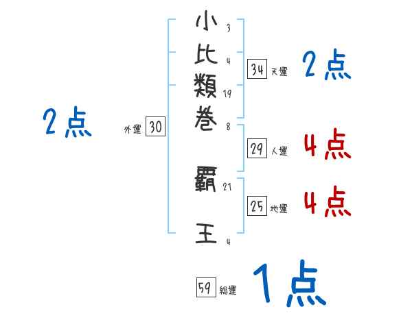 天運![]() | 小比類巻覇王さんの天運は34画の2つ星!独創性に優れるが、自尊心が強く災難に注意しましょう。 家系が持つ宿命的な運勢を表します。祖先から受け継いだ苗字ですので自分の力が及びません。家柄を象徴します。 |