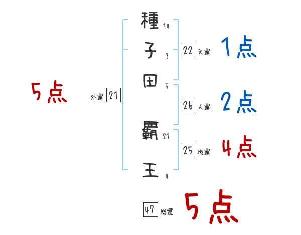 総運![]() | 種子田覇王さんの総運は47画の5つ星!実力が開花し発展する円満な人生。財に恵まれる。 あなたの人生を表す1番重要な運勢です。生涯を通じて影響する総合運となり、主に50歳以降の晩年期に影響を及ぼします。 |