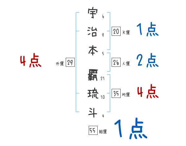 総運![]() | 宇治本覇琉斗さんの総運は55画の1つ星!欲張りな性格で軽率な行動に注意しましょう。病気に気をつけて。 あなたの人生を表す1番重要な運勢です。生涯を通じて影響する総合運となり、主に50歳以降の晩年期に影響を及ぼします。 |