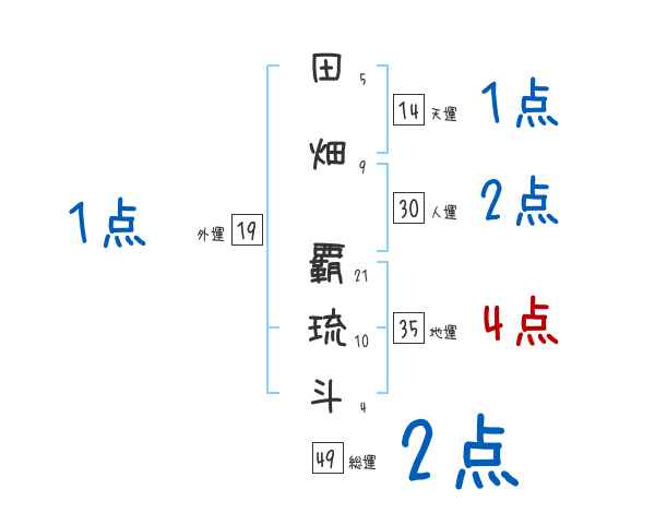 天運![]() | 田畑覇琉斗さんの天運は14画の1つ星!人に対して優しいがストレスを溜め込みがち。人間関係のトラブルを避けるよう気をつけましょう。 家系が持つ宿命的な運勢を表します。祖先から受け継いだ苗字ですので自分の力が及びません。家柄を象徴します。 |