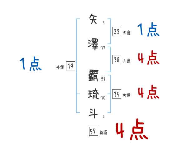 外運![]() | 矢澤覇琉斗さんの外運は19画の1つ星!優れた才能を持ちますが、協調性が足りないことも。周りの人と協力する事を意識しましょう。 生活面を象徴する運勢です。外部から受ける影響力を表し、結婚運、家庭運や職場、環境への順応性を表します。 |