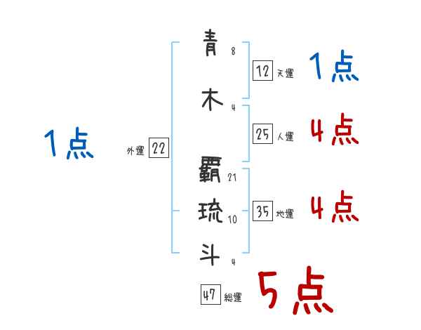 天運![]() | 青木覇琉斗さんの天運は12画の1つ星!簡単な失敗で諦めてしまいやすいかも。着実に行動すると良いでしょう。 家系が持つ宿命的な運勢を表します。祖先から受け継いだ苗字ですので自分の力が及びません。家柄を象徴します。 |