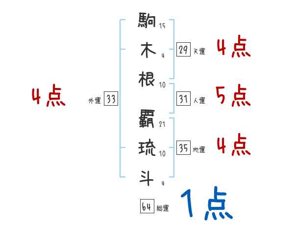 外運![]() | 駒木根覇琉斗さんの外運は33画の4つ星!権力志向でプライドが高い。勇気があり運を切り開き成功する。 生活面を象徴する運勢です。外部から受ける影響力を表し、結婚運、家庭運や職場、環境への順応性を表します。 |