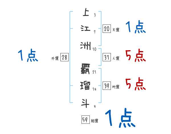 総運![]() | 上江洲覇瑠斗さんの総運は59画の1つ星!意志の弱さであきらめることが多いかも。粘り強さが必要。 あなたの人生を表す1番重要な運勢です。生涯を通じて影響する総合運となり、主に50歳以降の晩年期に影響を及ぼします。 |
