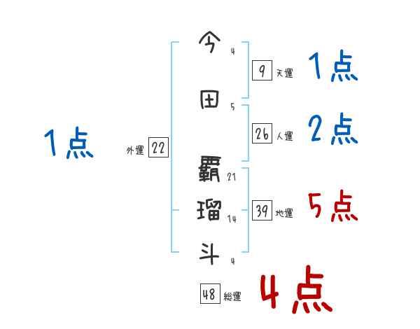 天運![]() | 今田覇瑠斗さんの天運は9画の1つ星!消極的で才能を発揮することが苦手なことも。周りの意見に耳を傾けましょう。 家系が持つ宿命的な運勢を表します。祖先から受け継いだ苗字ですので自分の力が及びません。家柄を象徴します。 |