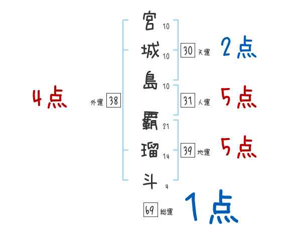 総運![]() | 宮城島覇瑠斗さんの総運は69画の1つ星!不満を感じやすい傾向が。ストレスを貯めないように注意しましょう。 あなたの人生を表す1番重要な運勢です。生涯を通じて影響する総合運となり、主に50歳以降の晩年期に影響を及ぼします。 |